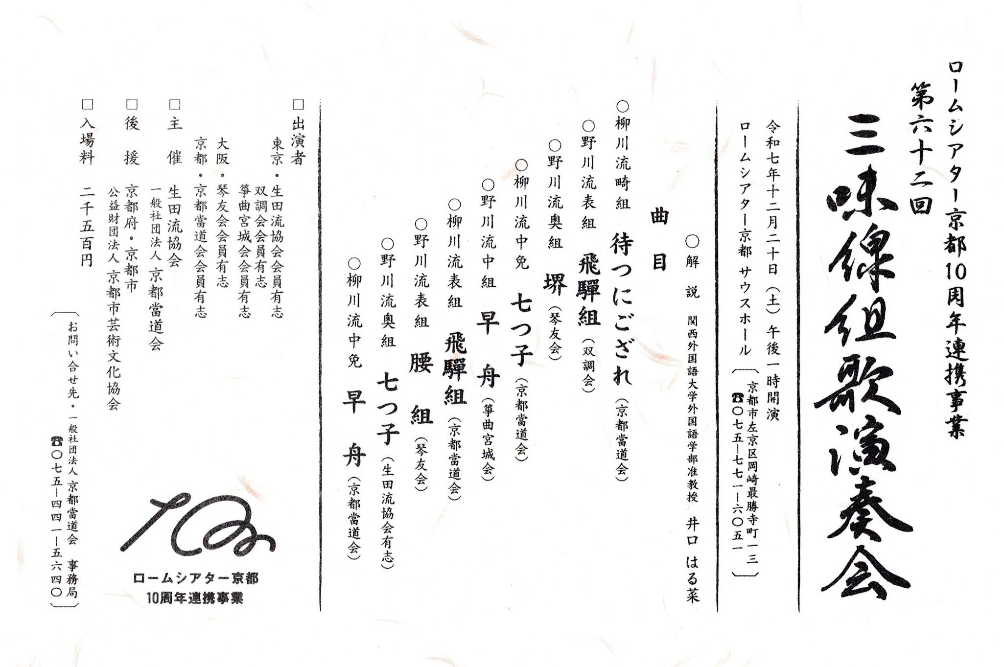 ロームシアター京都10周年連携事業 第62回三味線組歌演奏会 令和7年 12月20日(土) 午後1時開演 ロームシアター京都サウスホール 京都市左京区岡崎最勝寺町13 TEL:075-771-6051 入場料:2,5